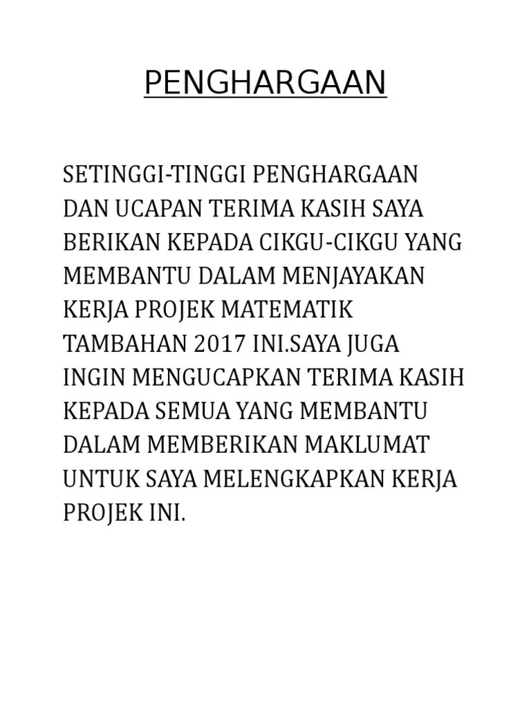 · pdf filemenunjukkan kedudukan awal. Kerja projek matematik tambahan 2017 negeri sembilan. Antara objektif kajian projek ini yang . Contoh jawapan kerja projek matematik tambahan 2018 penang. Kerja projek matematik tambahan ini dapat meningkatkan pengetahuan dan pengalaman tentang mengaplikasikan dan mengadaptasikan . Telah berjaya melaksanakan kerja projek matematik tambahan ini.